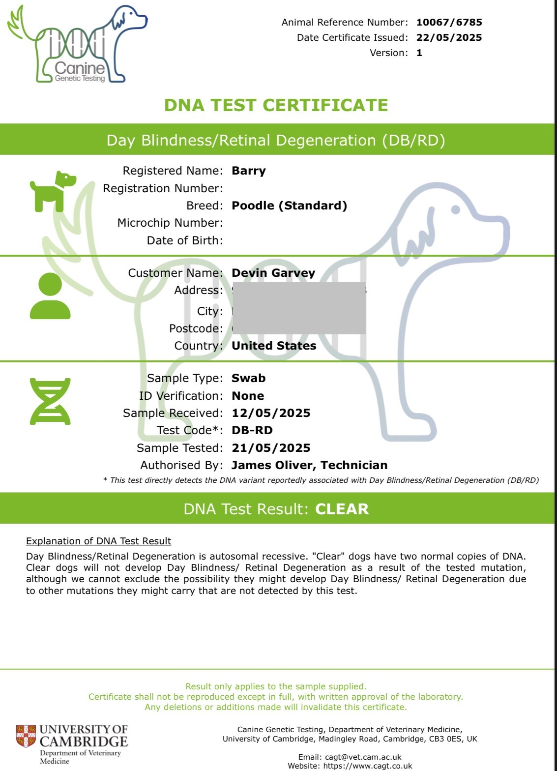 Health Testing: Eyes, Hips, HeartBetterbred (Diversity), Day Blindness, OFA CHIC #207776