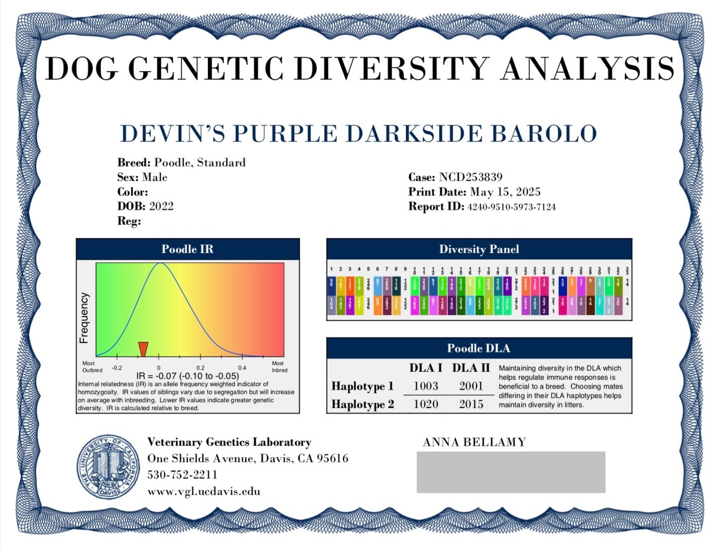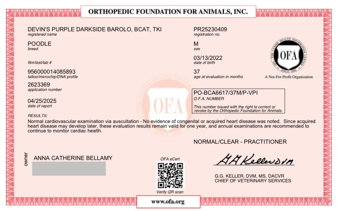 OFA eye test CHIC number poodle testing Devins purple poodles in Nebraska health tested