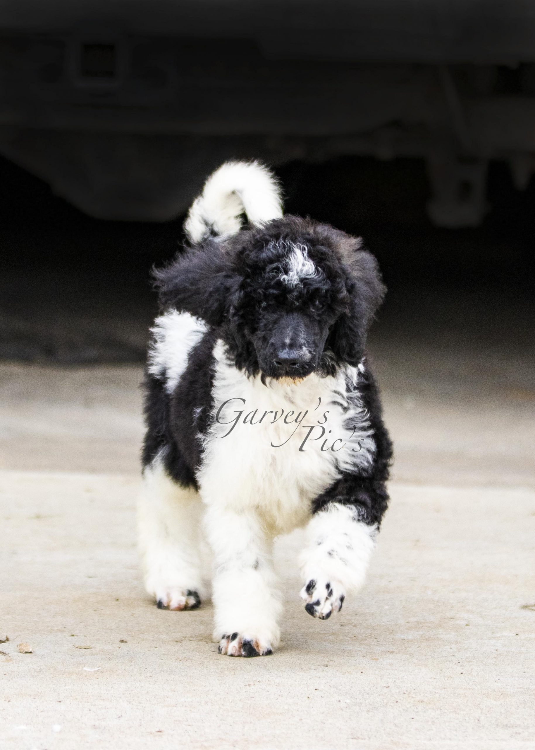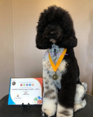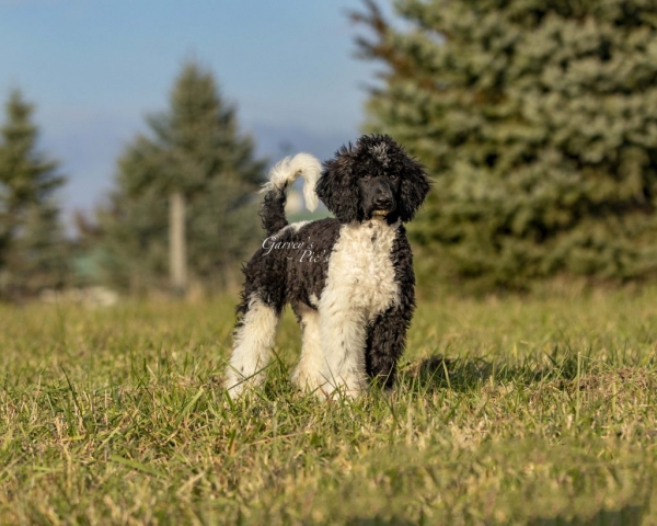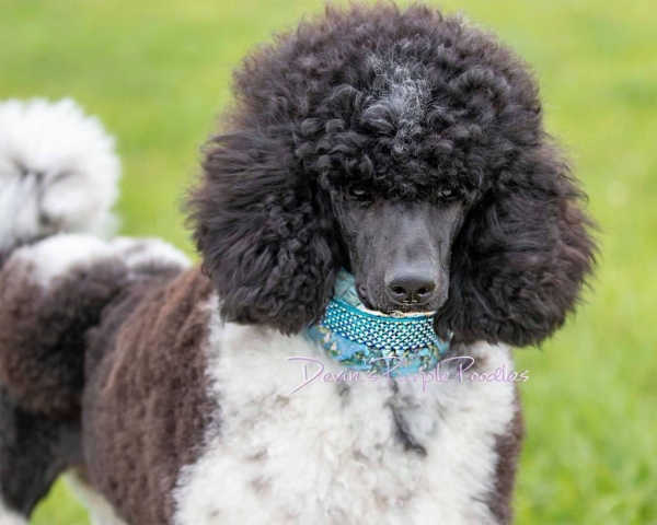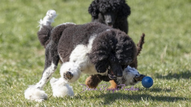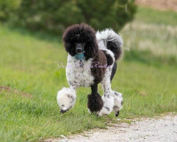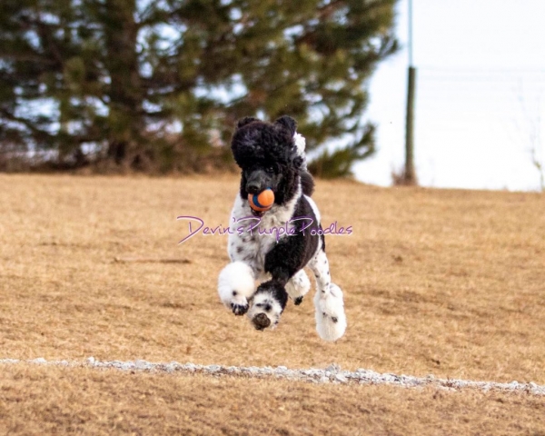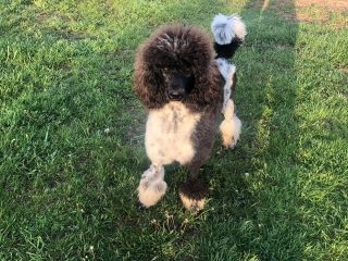 Lily is my small petite black & white parti standard she is 21 inches weighs 34lbs. This girl is athletic. She received a Canine Conditioning Novice title at a year old. Lily has a natural tail and it’s always wagging. Lily can go all day with different activities. One weekend we did a scentwork trail and she didn’t miss a beat. Lily plays well with puppies or rough and rambunctious boy dogs. She has a wonderful shut off switch too. I was sick for 3 days and she didn’t leave my bed side! Lily is truly my 💜 dog.